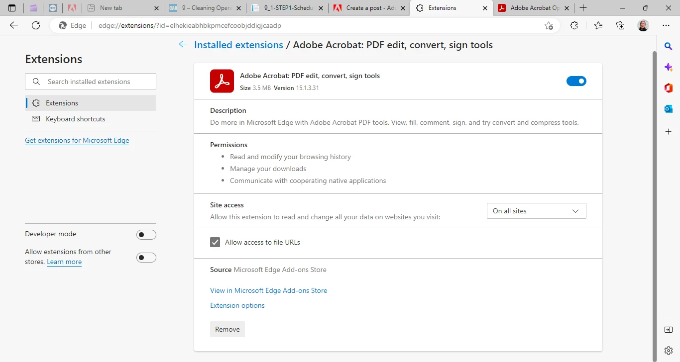 Hi, I installed an adobe acrobat extenion in Edge browser. I did all these: