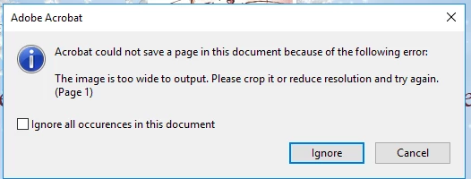 As error message says, "The image is too wide to output. Please crop it or reduce resolution and try again" seems this must be causing issue with a specific PDF which has a pdf page with the large content.