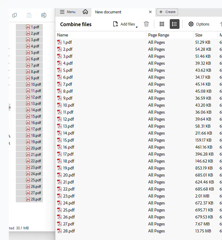 Windows 11 Enterprise, 23H2 OS build 22631.5472 and Adobe Acrobat Pro DC 2025.001.20531. I have a folder containing 28 PDFs. I select all, right click and choose "Combine Files in Acrobat". Acrobat will open into the Combine Files menu and it will only show a subset of the PDFs that I had selected, not all of the PDFs I had selected. All files are local on the computer, not out on a network or cloud drive.