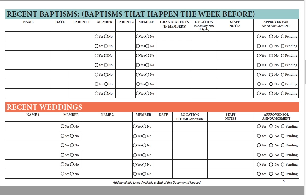 - rearrange rows (ie. there's already four names in a list under "recent baptisms" on my example below. They need to add a new entry at the top but also keep the other 4 names, since this is an announcements list. They want to be able to be able to move the whole new entry row to the top instead of below the old ones.
