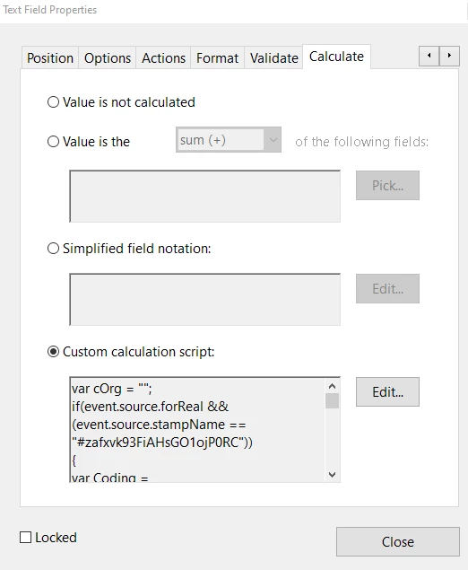 I have a script that creates a dialog box and stores the users responses in variables.  I now need to get that stored information to display in a text field on a dyanimic stamp. I can get the information to the variables, but when I try and reference the variable in the text field, I get nothing. Any help is appreciated. All the coding is entered into the first text field (bBx01) in the Text Field Properties, Calculate, Custom calculation script: