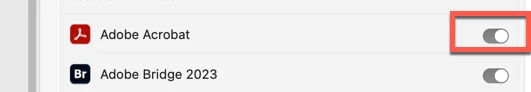 If you do not see Acrobat listed, click on the "+" button at the very bottom, which will open a Finder's window into the Applications folder. Select Acrobat Pro. Be sure to slide the On/Off button to On (to the right). You may need to enter your administrator's password at some point. You also may need to quit Acrobat and reopen.