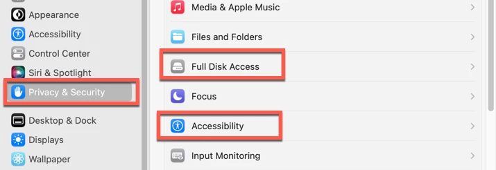 Go into the System Settings and select the Privacy & Security tab on the left, then First Full Disk Access, and after finishing that, select the Accessibility option. [Note: the location of the tabs may or may not match what I’m showing.]