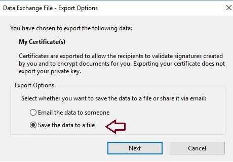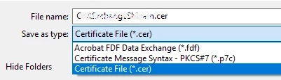 Select Save the data to a file while exporting and select .cer file from save as type drop-down.