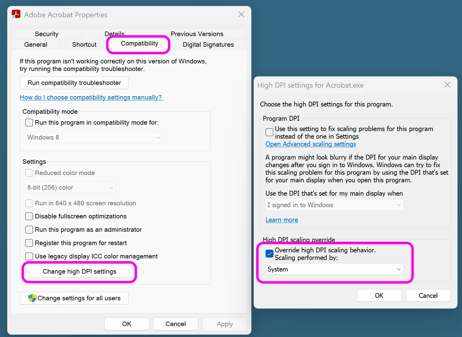 - Place a checkbox on "Override high DPI scaling behavior and select "System".