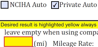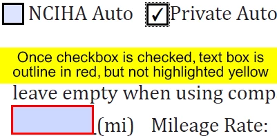 The desired outcome is to have the Mileage box highlight yellow as soon as Private Auto is checked.