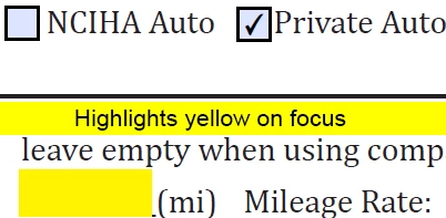 I am working on a travel form. I want to highlight the Mileage box yellow when the "Private Auto" checkbox is checked. I have it working where the Mileage box is set to Required and gets a red boarder, but the background color doesn't change from the blue highlight. However, as soon as you click into the Mileage box it turns yellow. My desired result is for the highlight color of the Mileage box to turn yellow as soon as the checkbox is checked. See the attached screen shots.