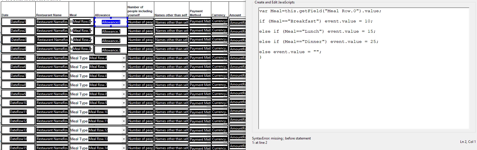 I am attempting to create a reimbursement form, I have a field called Meal Row.0 that is a drop down. The options are Breakfast, Lunch, Dinner. The next field Allowance.0, I need the allowance to populate. So if Meal Row.0 is Breakfast, the allowance needs to be 10.00, Lunch is 15.00, and Dinner is 25.00. I have read over many different posts, but I get the SyntaxError: missing : before statement: at line 2. Below is a screenshot of what I have so far.