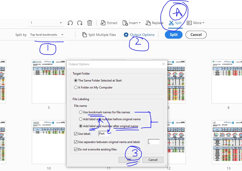 in adobe acrobat pdf for split file using bookmark name as labels suffix after original file name