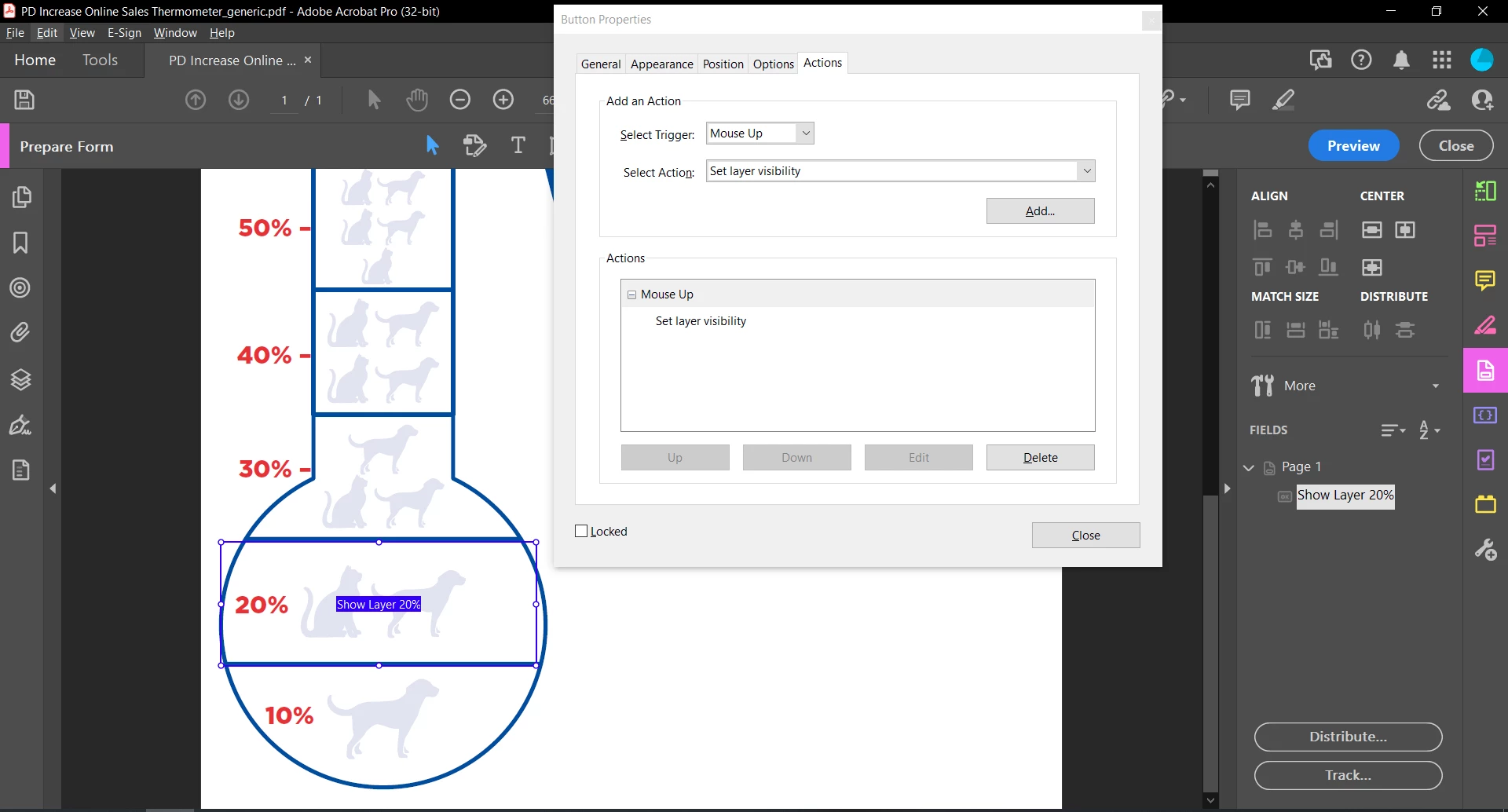Hello, I have created an Indesign document with a fundraising thermometer, then exported to pdf. It has been approved for print, but now my client wants a digital version where the managers can click each section of the thermometer as the goal is reached, and have it fill in with colour. I have created a document in Illustrator with 10% to 100% filled thermometers as artboards and also a version as layers. How do I import them so that the manager can click in the 10% area and it will show the 10% filled image? I have attached the document and a sample filled in part of the thermometer. Hope this makes sense...I'm desperate lol. Any help greatly appreciated!! Thank you in advance.