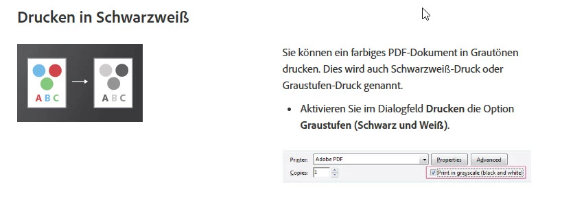 auf meinen neuen Laptop musste ich Adobe 64Bit installieren. Adobe stelt einige bessere Funktionionen für das Drucken zur Verfügung. Unter anderem das kontrollkästchen "Drucken in Schwarzweiß"