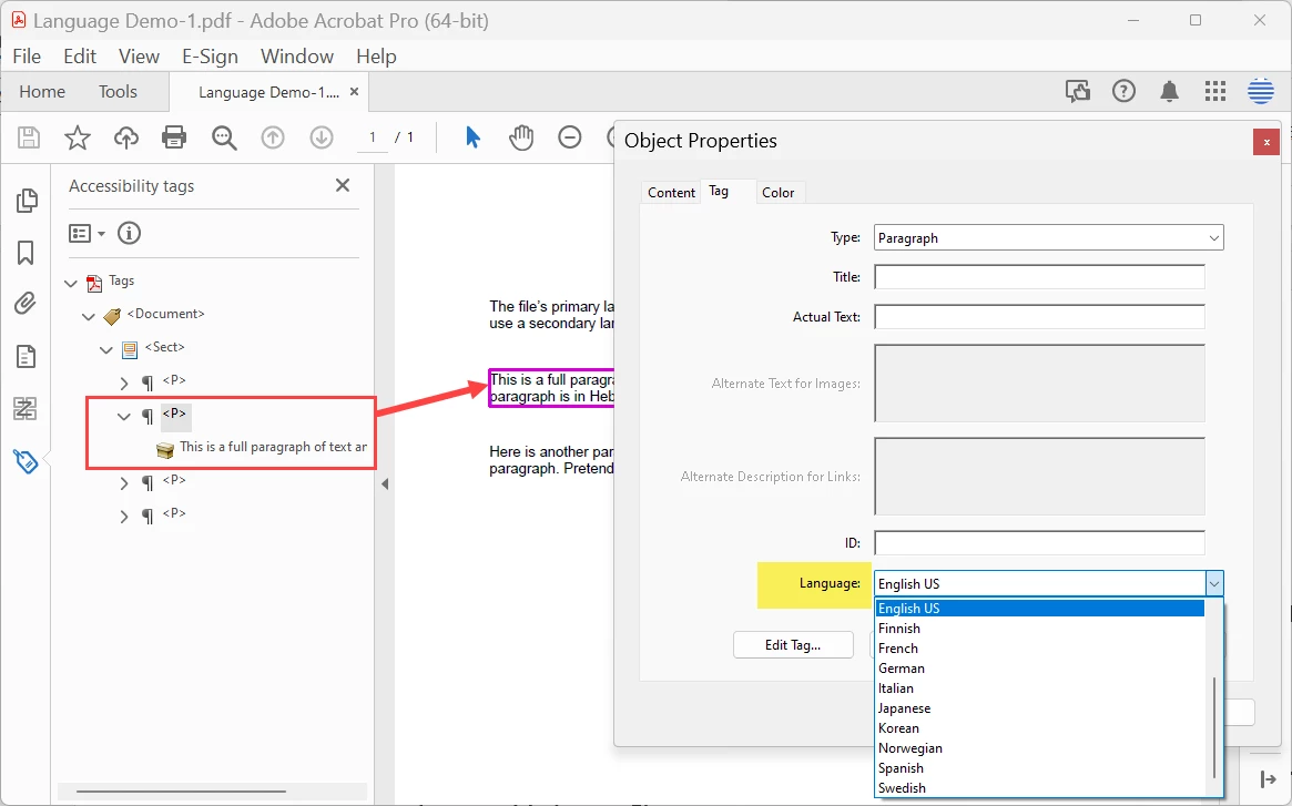 First, there are two ways to designate language in a PDF. One is global that sets the primary language for the entire PDF file, the other is for selected paragraphs or words that use a secondary language.