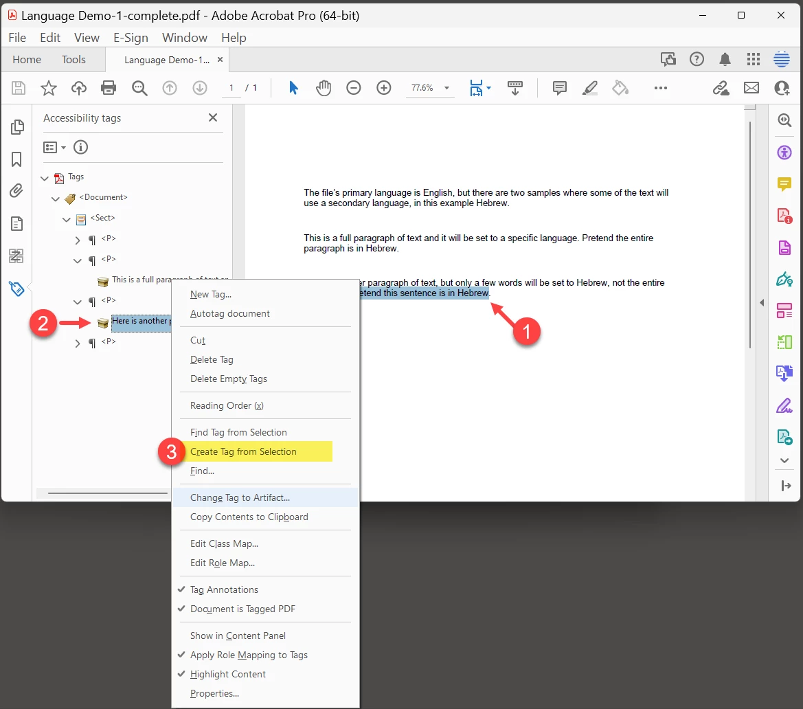 Step 2: Right-click the yellow content container (not the tag) and Step 3 choose Create Tag From Selection. This function is a bit buggy in Acrobat, and you might not get a separate <Span> tag as intended,