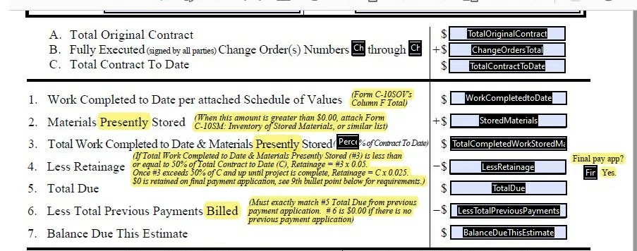 FinalPayApp is the check box. A zero cannot show in the LessRetainage field when someone first opens the pdf in case they choose to print it and handwrite the info. The conditions for the autopopulation of the LessRetainage field are: If Total Work Completed to Date & Materials Presently Stored (#3) is less than or equal to 50% of Total Contract to Date (C), Retainage = #3 x 0.05. Once #3 exceeds 50% of C and up until project is complete, Retainage = C x 0.025. $0 is retained on final payment application.