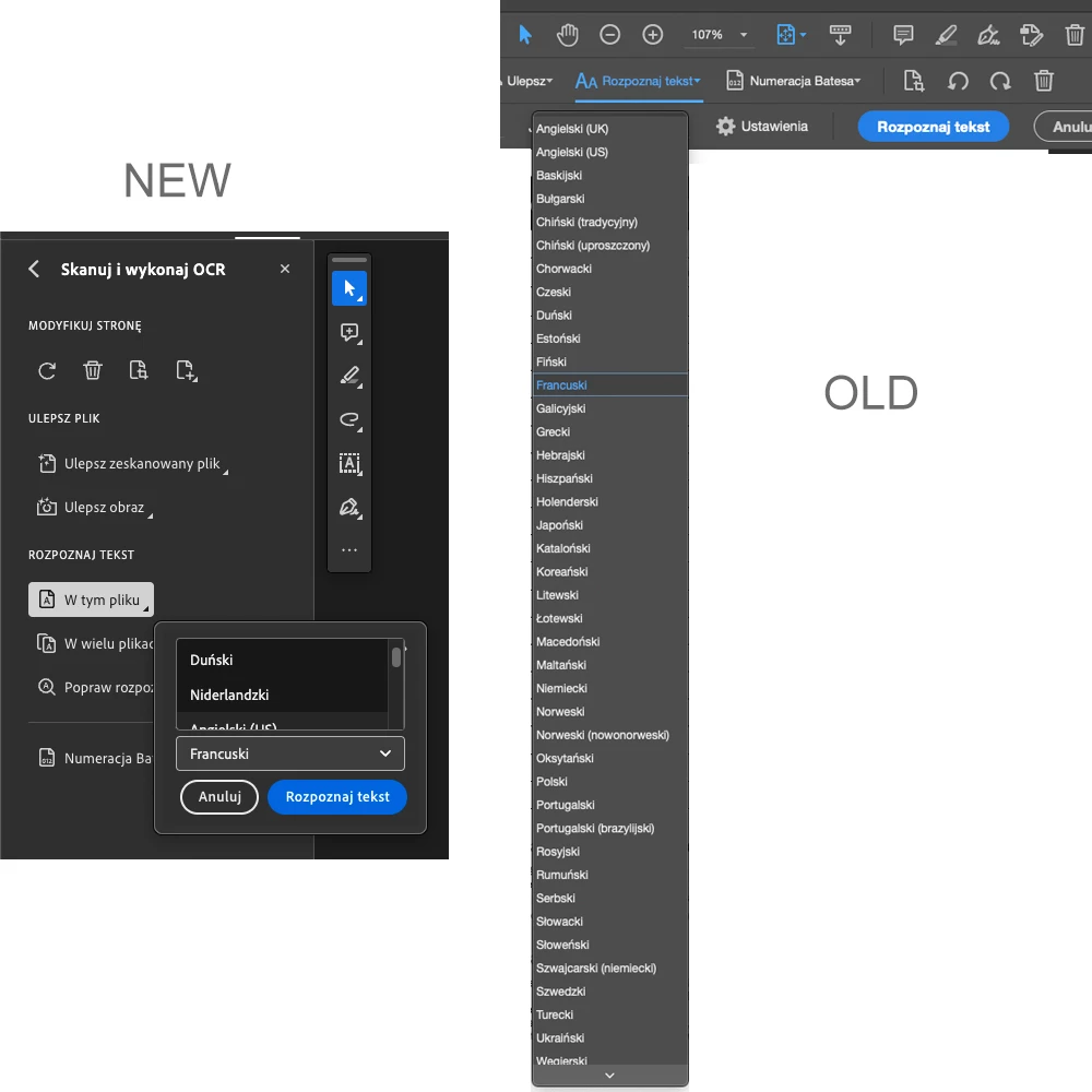 The language selection window in the new GUI is so small and it's so hard to select a language that I get the impression that someone did it to make the work more difficult. Not to mention the fact that the languages are not arranged alphabetically (in the Polish version). The older option was much more readable and functional. Unfortunately I can't switch to the older one because OCR crashes Acrobat.