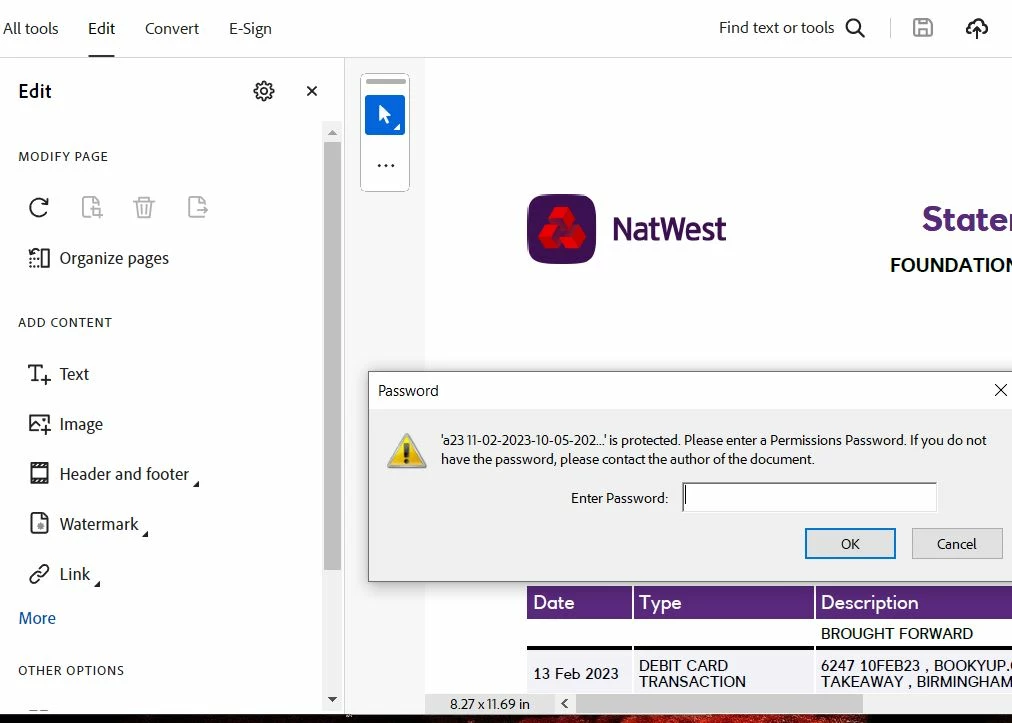 PASSWORD REQUIRED - can't edit PDF of bank statement