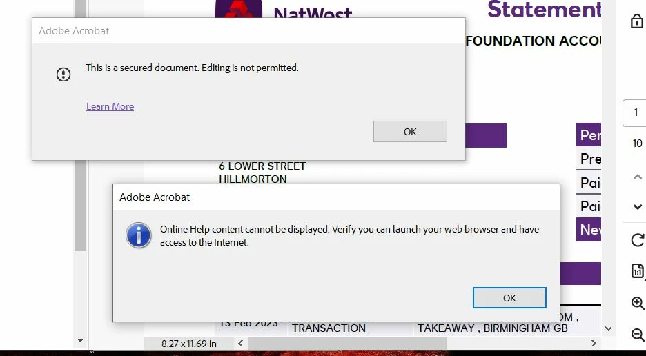 I've JUST downloaded a free trial version of Acrobat with a view to editimg some PDF's of Bank Statements for annotation for my tax return - and I am blocked from editing because - it says- the documents nare password protected - ID or licence number required. hitting "lean more" asks me to validate further access
