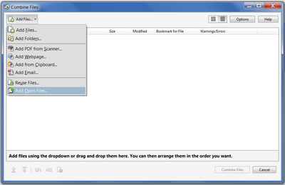 Go to File - Create - Combine files into a single PDF, and then click on Add Files and select "Add Open Files":