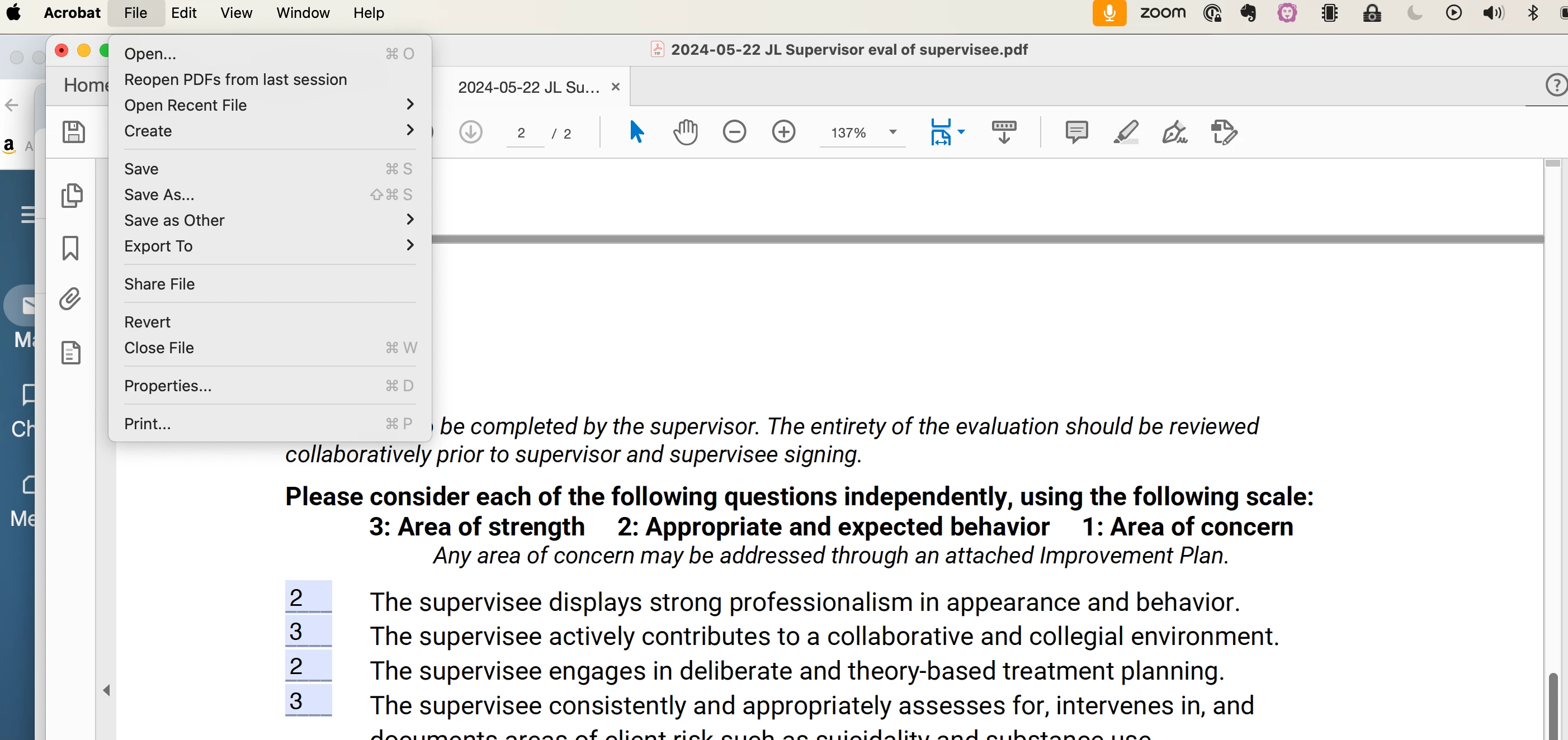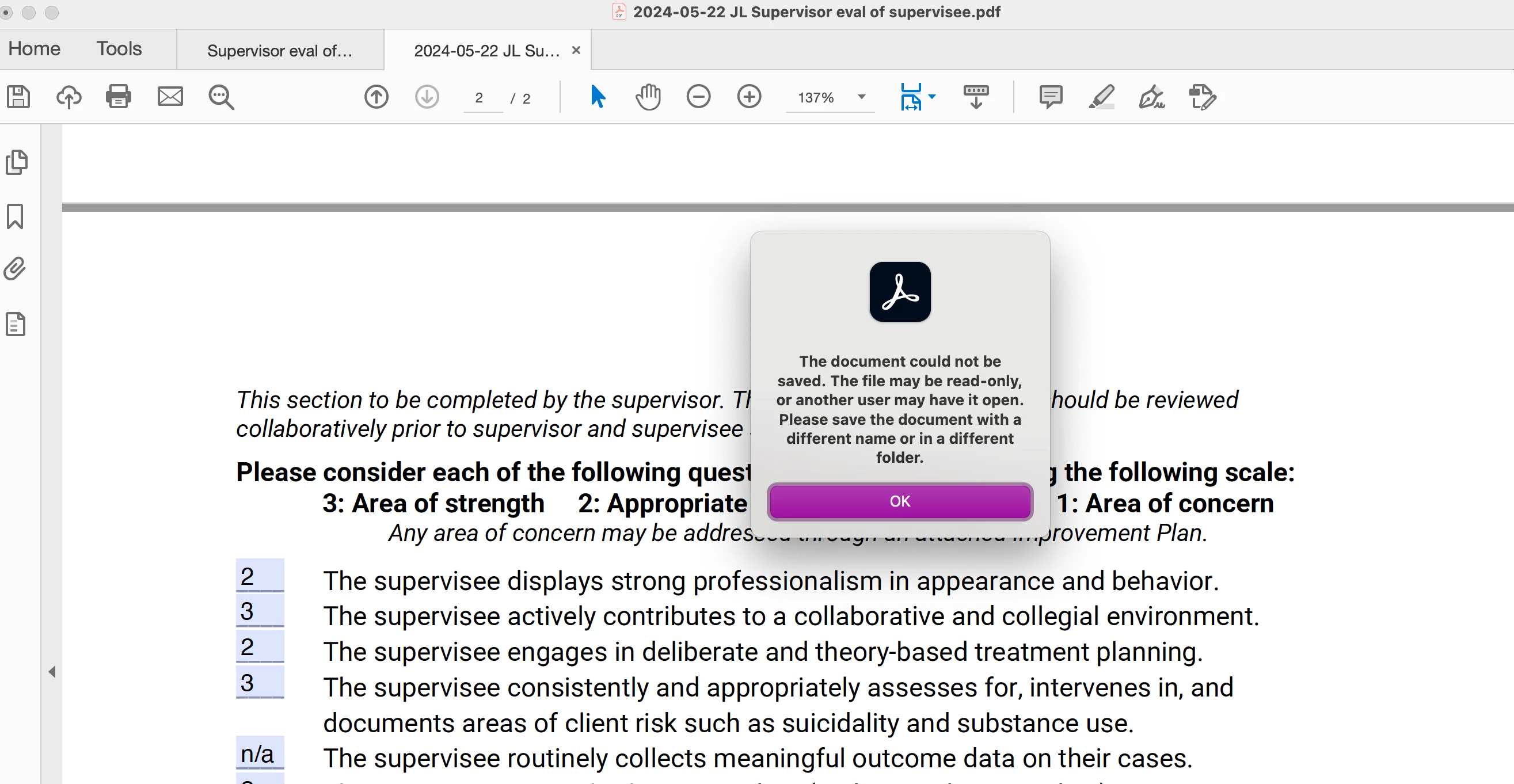 I'm using Acrobat Pro 2020 for Mac, Mac OS Sonoma 14.5. I am trying to add information to a document that is a fillable form, part of which was filled out already by an employee (but not signed). I have added info but now when I try to save, I get the error "The document could not be saved. The file may be read-only, or another user may have it open. Please save the document with a different name or in a different folder."