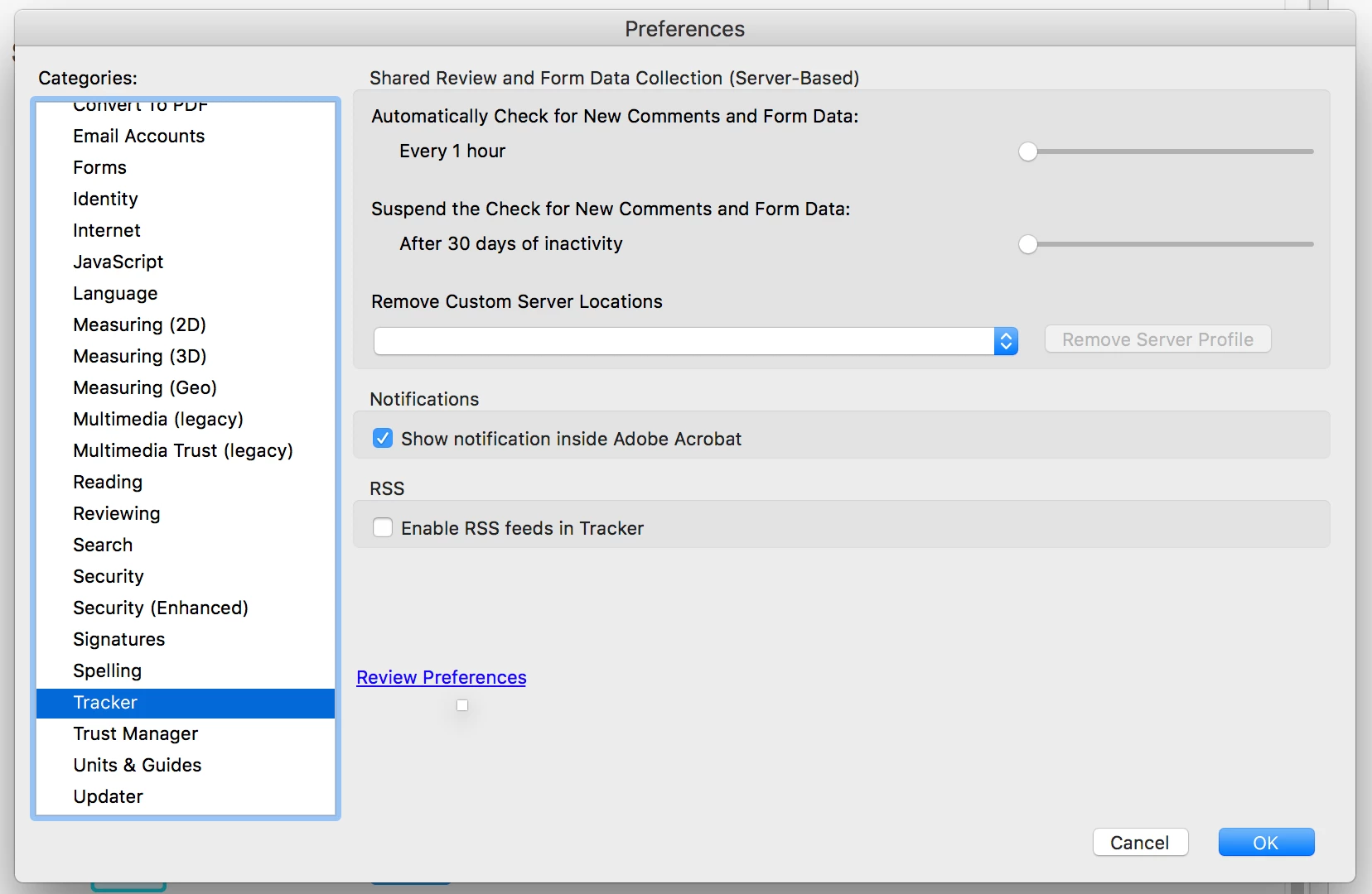 I get a warning every HOUR that I need to connect to an outside server. I have trouble shot with the Apple tech support as well as my office tech support. The problem goes away when I uninstall Acrobat. (I have a CC subscription, so it's the most recent version) I had done a shared review a while ago, but have since deleted all files related to that review off my computer as well as icloud. I need Acrobat and would like to have it installed. HOW do I remove this problem? There is no server listed in the tracker preferences. (see attached files)