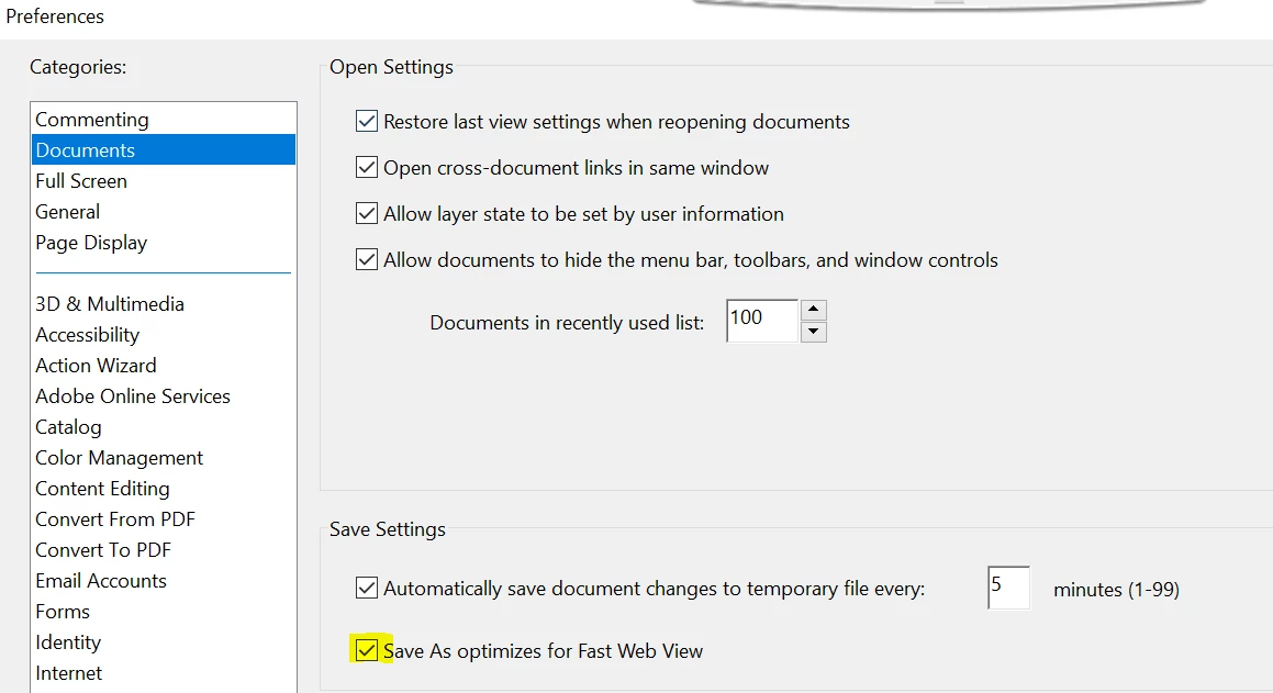Also, navigate toe Acrobat's preferences once, from Edit>Preferences>Documents>Uncheck "Save as optimizes for Fast web view", then try saving the file.