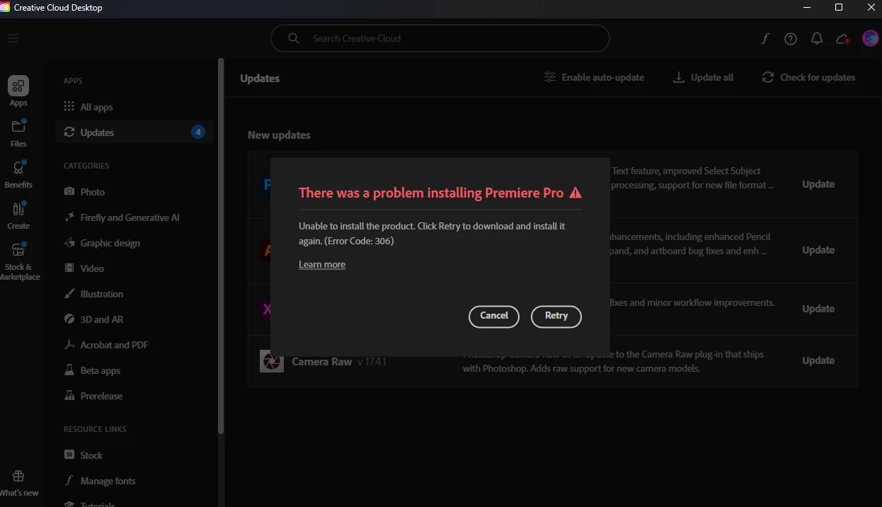 Hi. I'm facing same error but for premier pro. I cant install premier and i also cant update the softwares neither i update the creative cloud.