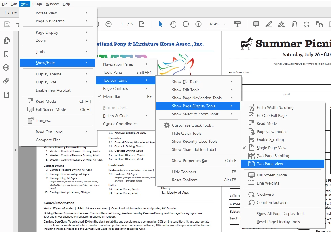5. Now you'll need to tweak your toolbar to get it the way you like it. Go to View > Show/Hide > Toolbar Items and look through the submenus. If you want to add something to the toolbar, click on it to add a checkmark. For example, you might want "Two Page View" as well as "Single Page View" in your toolbar. I certainly do!