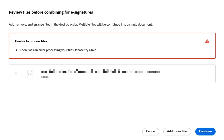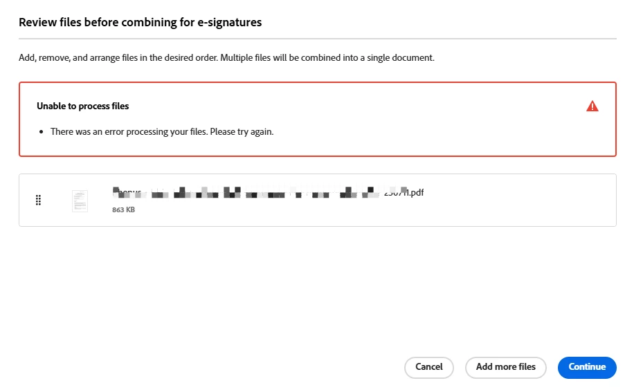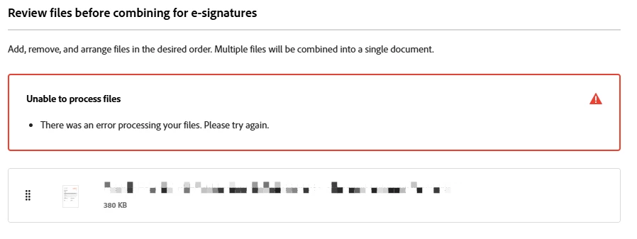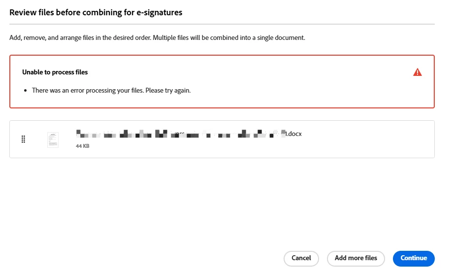 I tried several times with different pdf / docx files, but I keep receiving error message as below when I try to request e-signatures: