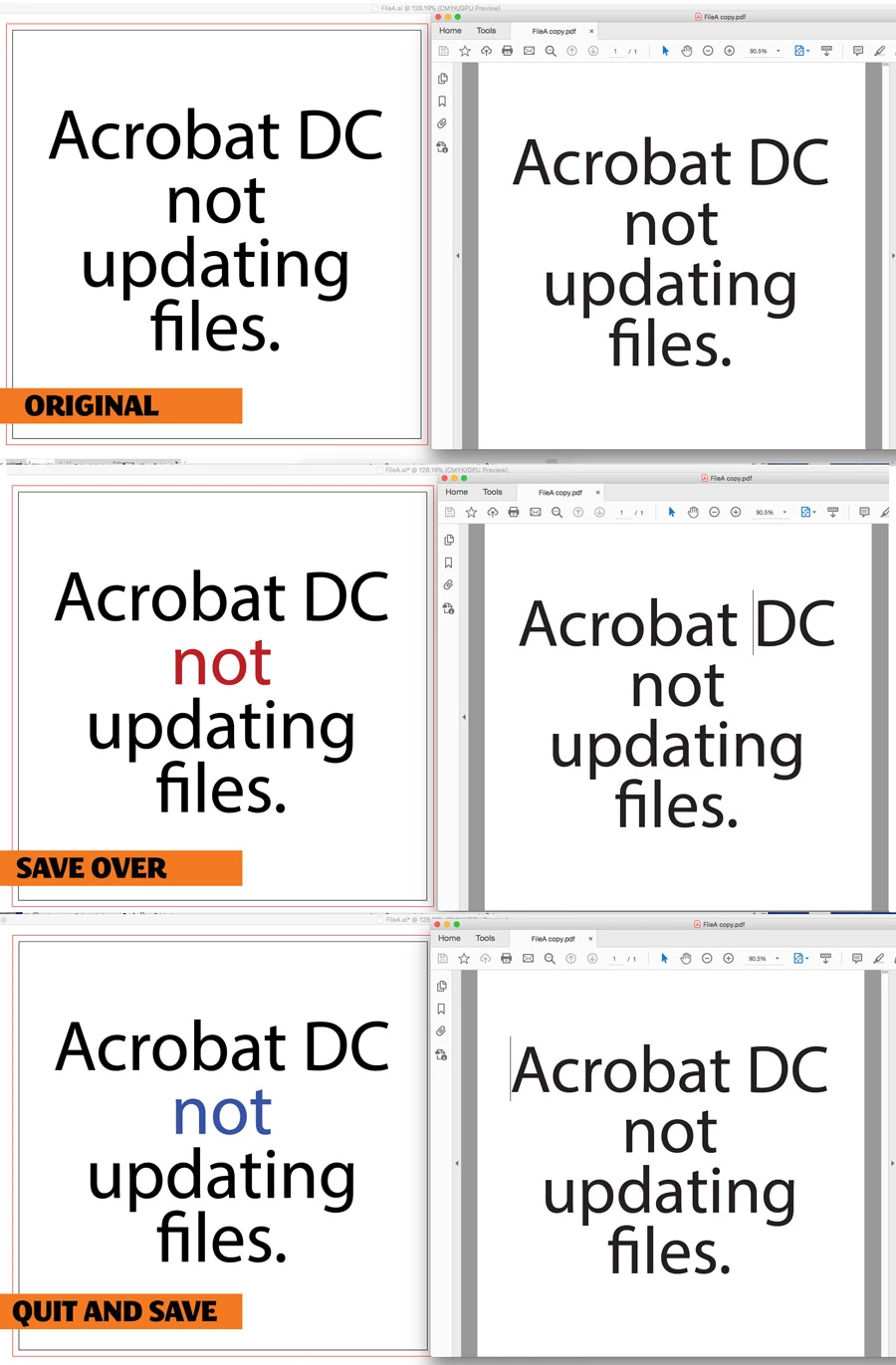 (Mac oS X high Sierra, Pro DC Build: 19.21.20058.359605) This started happening with last Acrobat Pro DC update - while working ongoing on an ai or indd file and saving a pdf to my desktop, the pdf does NOT update. In other words, if I make a change to the ai or indd file and save over the pdf Acrobat will not update the file. Even if I delete the pdf and save a pdf to the desktop with same file name the change will not take effect. Quitting Acrobat and reopening does not help. I have to change the pdf file name in order for the change to take effect. Below is three tests from one file, saved pdf, save over, and quit and resave. The right side is the pdfs and they do not update. No amount of quitting or deleting older pdfs is fixing this one.