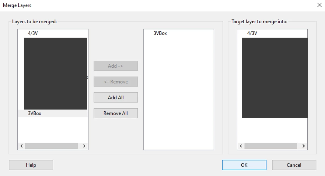 In the below screenshot, I want the picture from the "3VBox" layer to be merged into the "4/3V" layer, so after selecting "3VBox" from the options on the left (bringing it to the middle) , I would click on "4/3V" on the right box and then select "OK". Once I do, the "3VBox" layer does disappear, as expected, but its picture is nowhere to be found on the "4/3V" layer. Am I doing something wrong in the below screenshot, or do I just not understand how merging works? Thanks!!