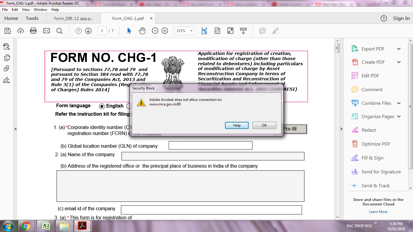 I am using the latest version of Adobe reader, i am using this software to fill some forms by taking access from several website, most of them required access from a website www.mca.gov.in