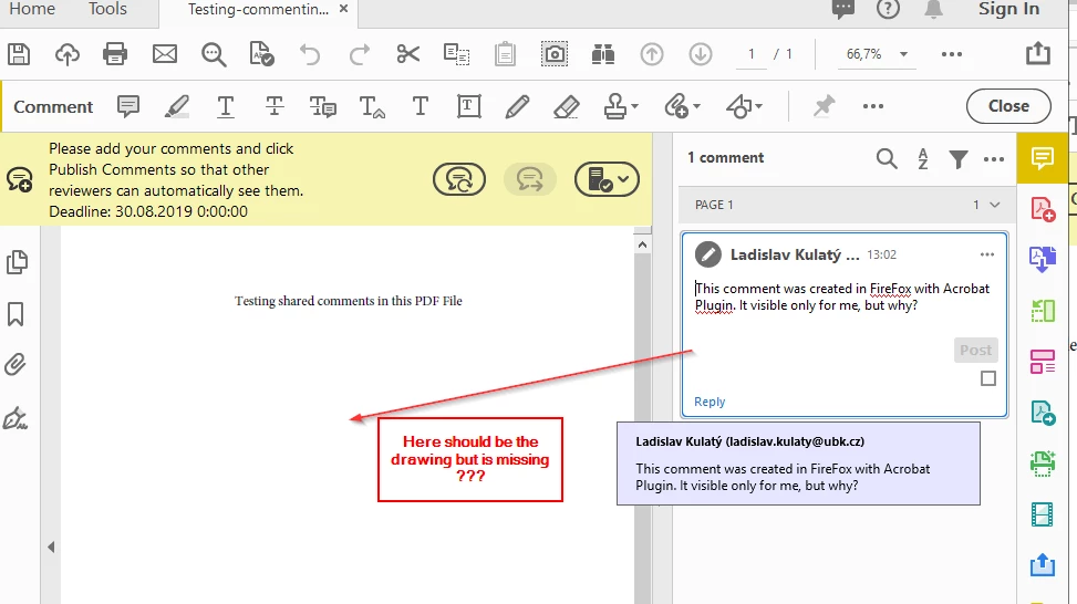 I have a problem with Shared Commenting feature in Acrobat Pro DC used with web browser plugin (Adobe PDF plugin for FireFox and Netscape 19.12.20036). When a reviewer creates a comment (drawing, stumps...) via the browser plugin the comment is visible in right panel and in document correctly but for all other reviewers is visible only in right bar but not in the document. It seems that the comment is there because when the reviewer moves mouse cursor over the area of the missing comment the small popup with comment info appears. The problem doesn't happen when the comment is created in full Acrobat DC Pro so it must be connected just with the plugin.