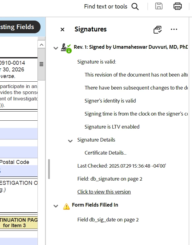 As you can see on the panel, Acrobat says that a field, db_sig_date (the signature date?), has been filled in after signing. This would mean that indeed the document has been changed after signing.