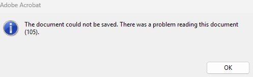 The document could not be saved. There was a problem reading this document (105).