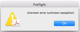 When I attempted to preflight a particualr PDF I'm getting an "Uknown error (unknow exception)". This happens with any type of preflight, even to check the syntax issues. I've tried it on two separate computers, both with Acrobat Pro DC (version 2017.009.20044), and both came up with the same error.