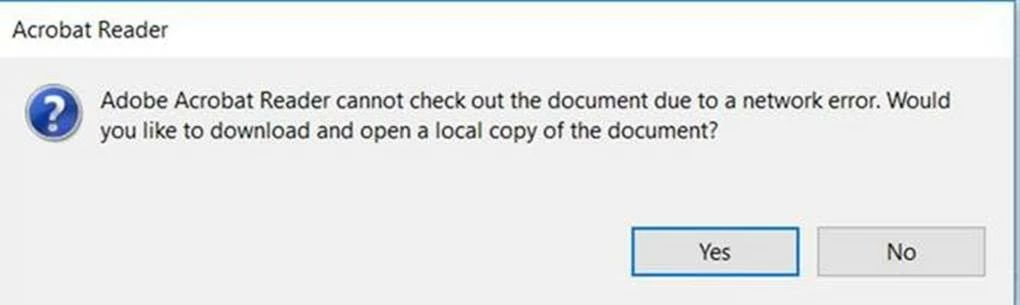 When the user tries to open the file, the error they get is "Adobe Acrobat Reader cannot check out the document due to a network error. Would you like to down load and open a local copy of the document"