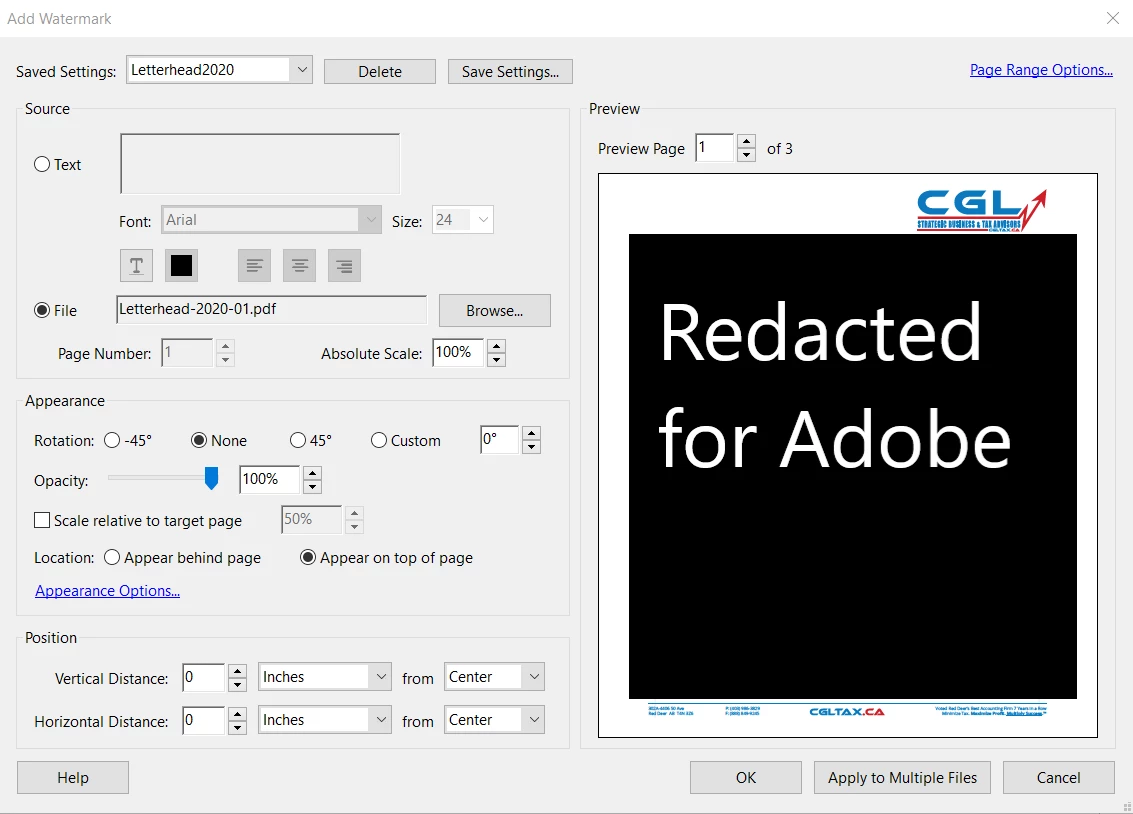 So I browse to the file, have the page ranges sent, the appearances set, everything set the way it should be. I save these settings as "Letterhead2020"