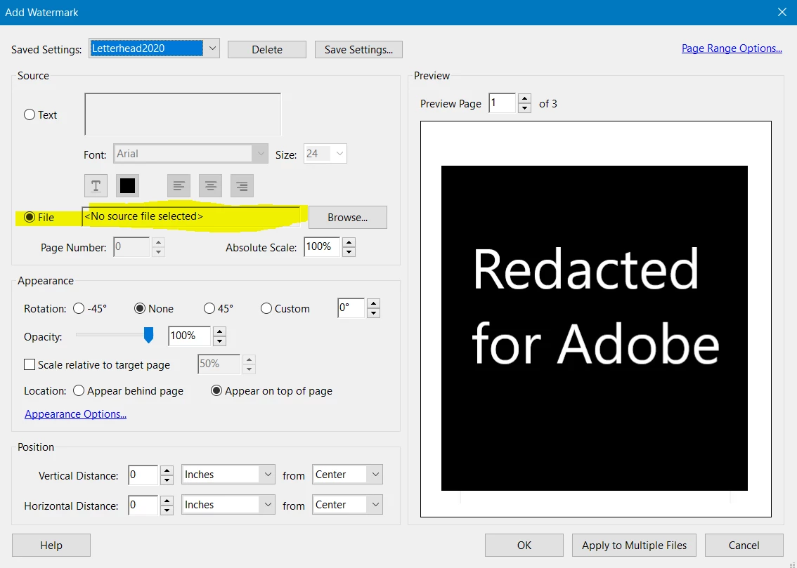 If I exit Acrobat DC, and re-open the application when I go to use the Saved Settings, and select "Letterhead2020" everything works except it says "<no source file selected>" beside file.  I then have to hit browse and bring it up again.