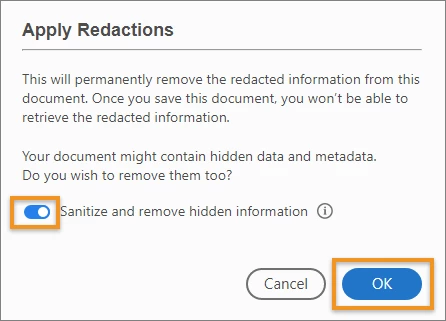 - In the Apply Redactions dialog, choose if you want to remove the hidden information by clicking the toggle button. Acrobat retains the chosen setting. Click OK.