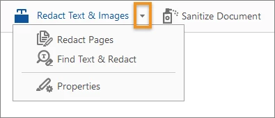 Redact Text and Images: The Redact Text & Images action is selected by default. It enables you to start marking the text and images you want to redact without having to select any action in the tool. Click the drop-down to Redact Pages, Find Text & Redact, or set the appearance of redaction marks using Properties.