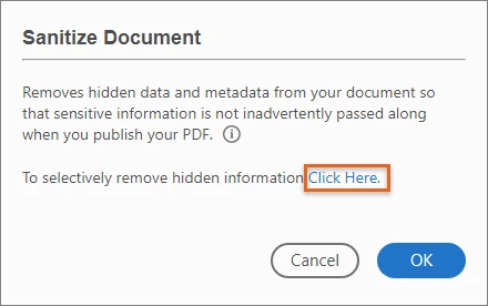 Sanitize Document: The Remove Hidden Information is now an optional action within the Sanitize Document action. When you sanitize a document, it removes the hidden information as well. To selectively remove hidden information, click Sanitize Document and then click the Click Here hyperlink.