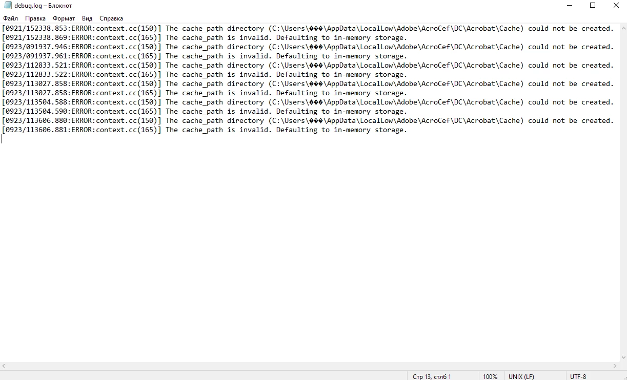 The cache_path directory (C:\Users\R�der\AppData\LocalLow\Adobe\AcroCef\DC\Acrobat\Cache) could not be created.