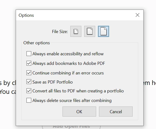 When you're in the combine window select the "gear" options and choose the middle file size.