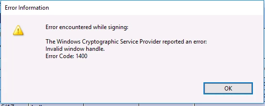 Windows Cryptographic Service Provider reported an error: Invalid Window Handle. Error Code: 1400