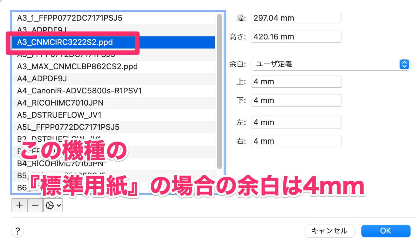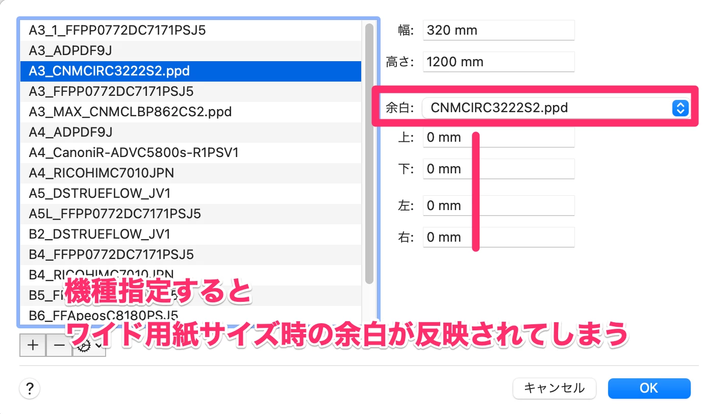 プリンタのPPD(ページサイズ、名称、余白等)ファイルを