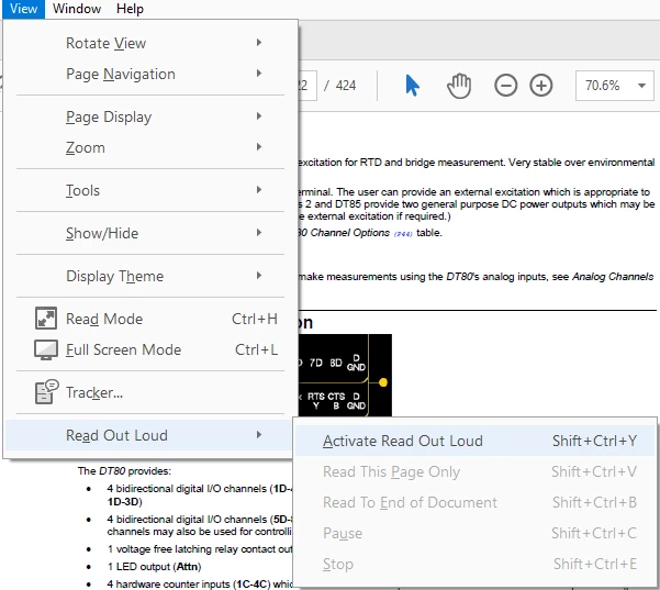 You can also refer to Accessibility features, Adobe Acrobat Reader DC