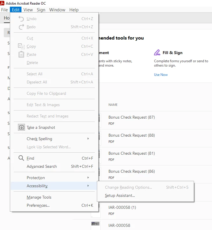 Under Edit-> Accessiblity -> "Change Reading Option" shows disable. how to enable it ?