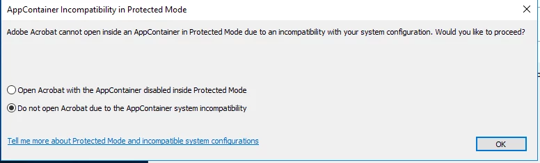 We're recieving the error "adobe reader cannot open in protected mode due to an incompatibility with your system configuration. Would you like to proceed?" this is then backed up by two radio buttons.
