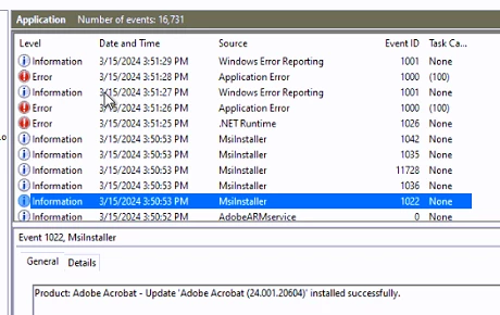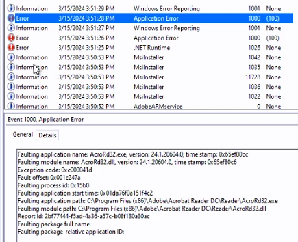 We have just had Acrobat Reader update, it looks like it got a new interface, however it keeps crashing, it will stay open for a couple of seconds and then close, no error reported to the user. However we do see the crash events in the event log. We had no issues on the previosu version and this has now become a real issue for us.