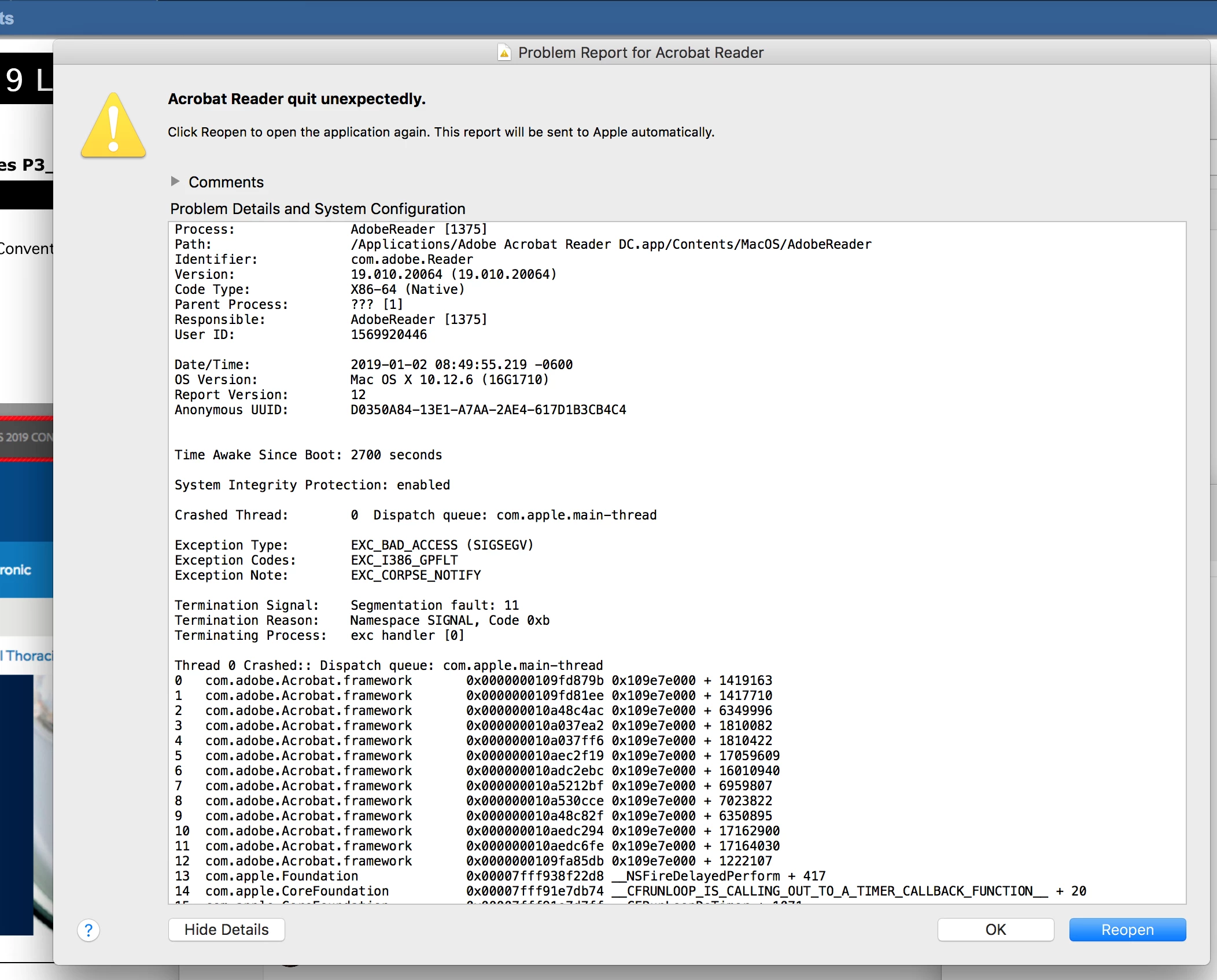 I have a user who uses Adobe Acrobat Reader DC version: 2019.010.20064 on Mac OSX 10.12.6